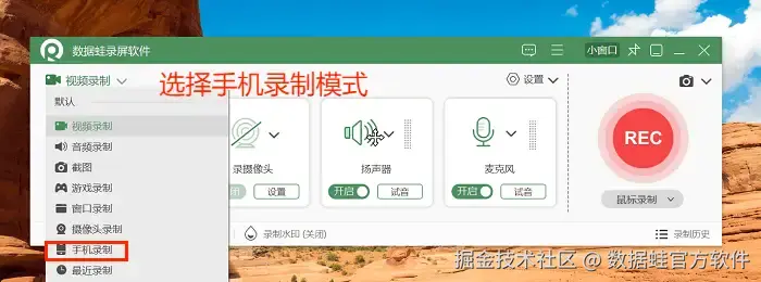 步骤1:打开数据 蛙录屏软件,然后进入页面后选择需要的录制模式。本文选择“手机录制”模式。
