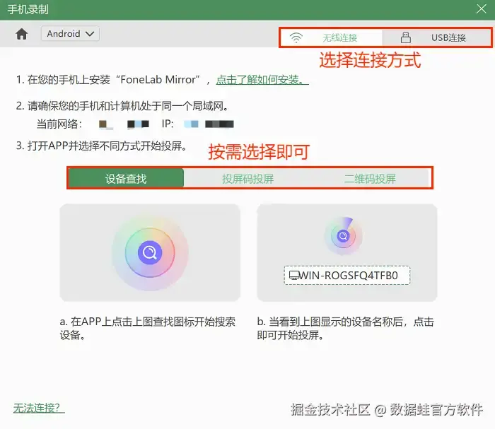 步骤2:根据手机型号选择录制的设备类型,小米手机选择“安卓录制”。接下来选择手机连接电脑的方式,本文以“无线连接”为例。