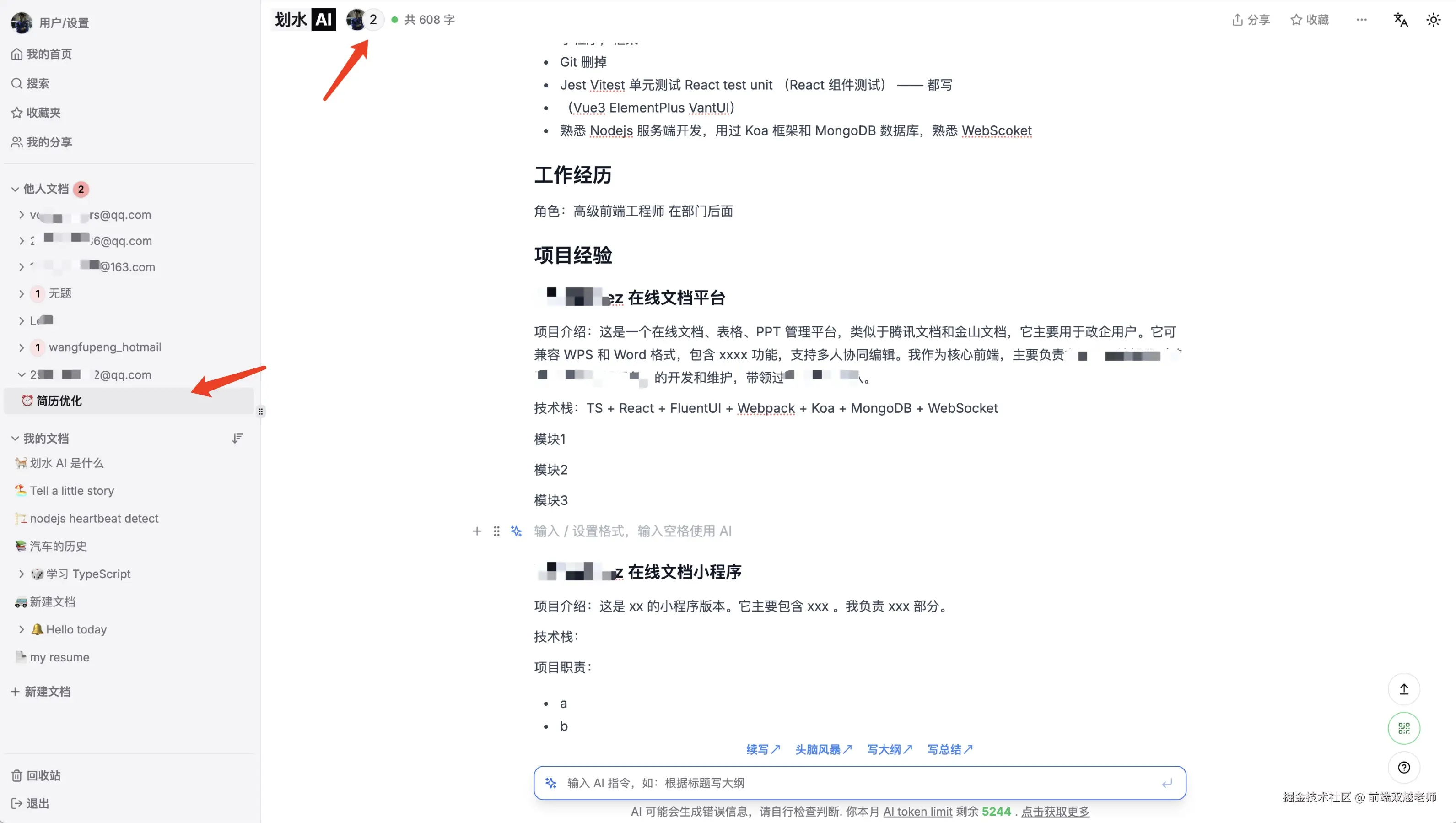 另外,划水AI 还支持使用 AI 智能生成文档内容,以及 AI 智能优化文字,如下图。