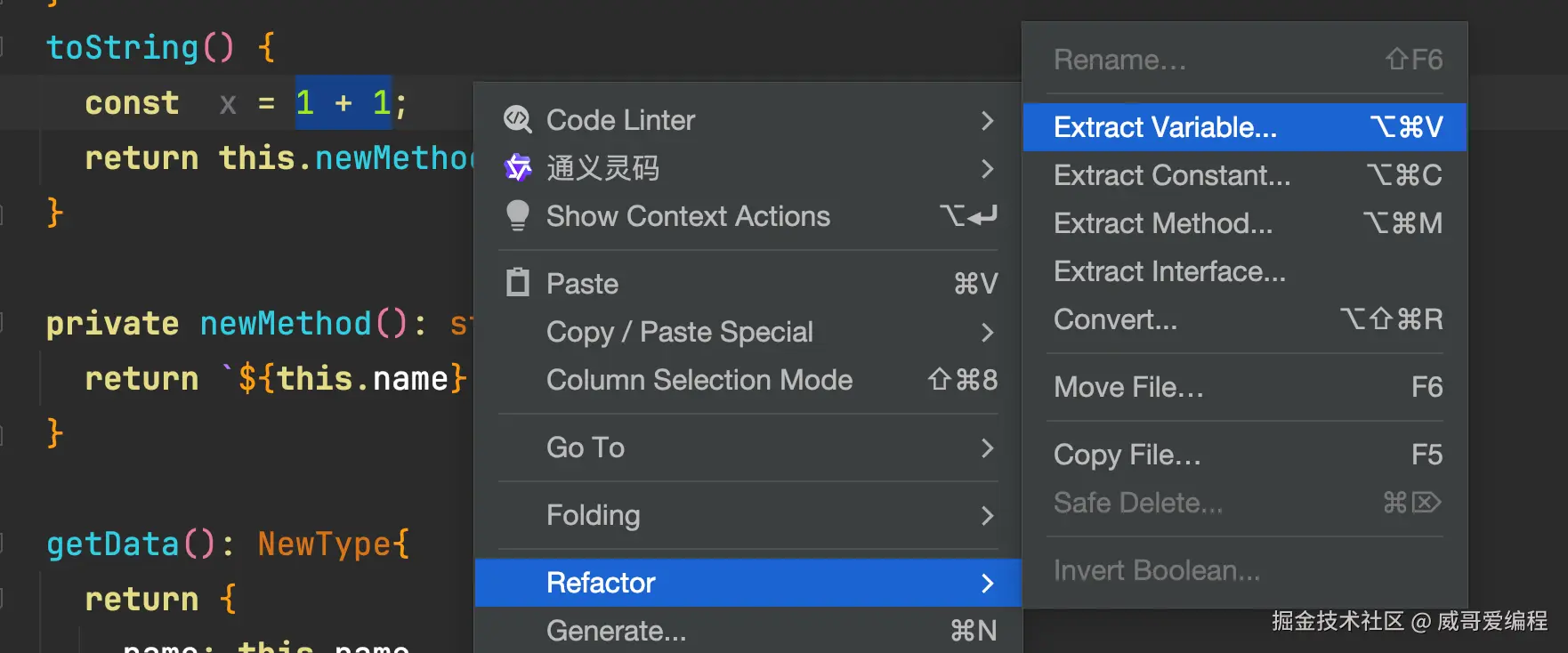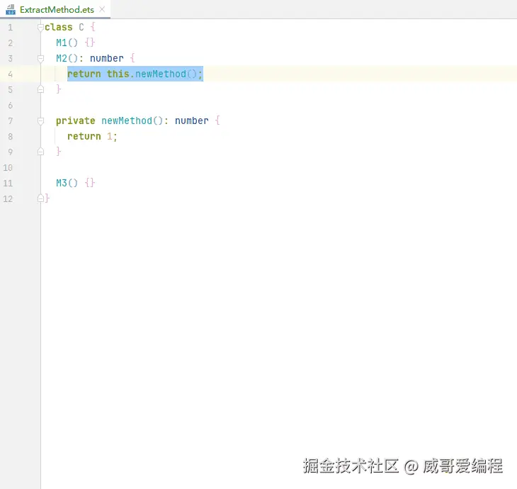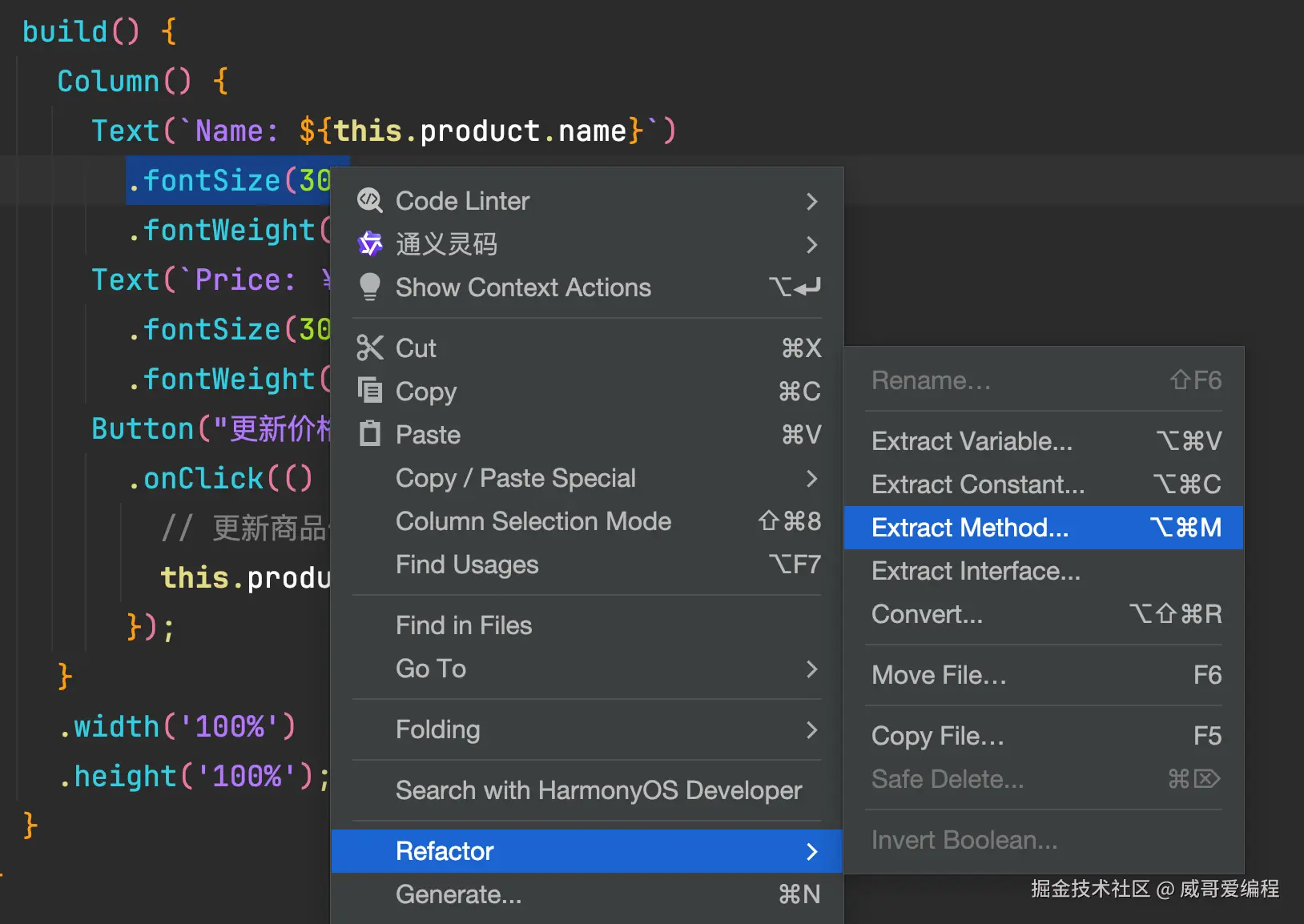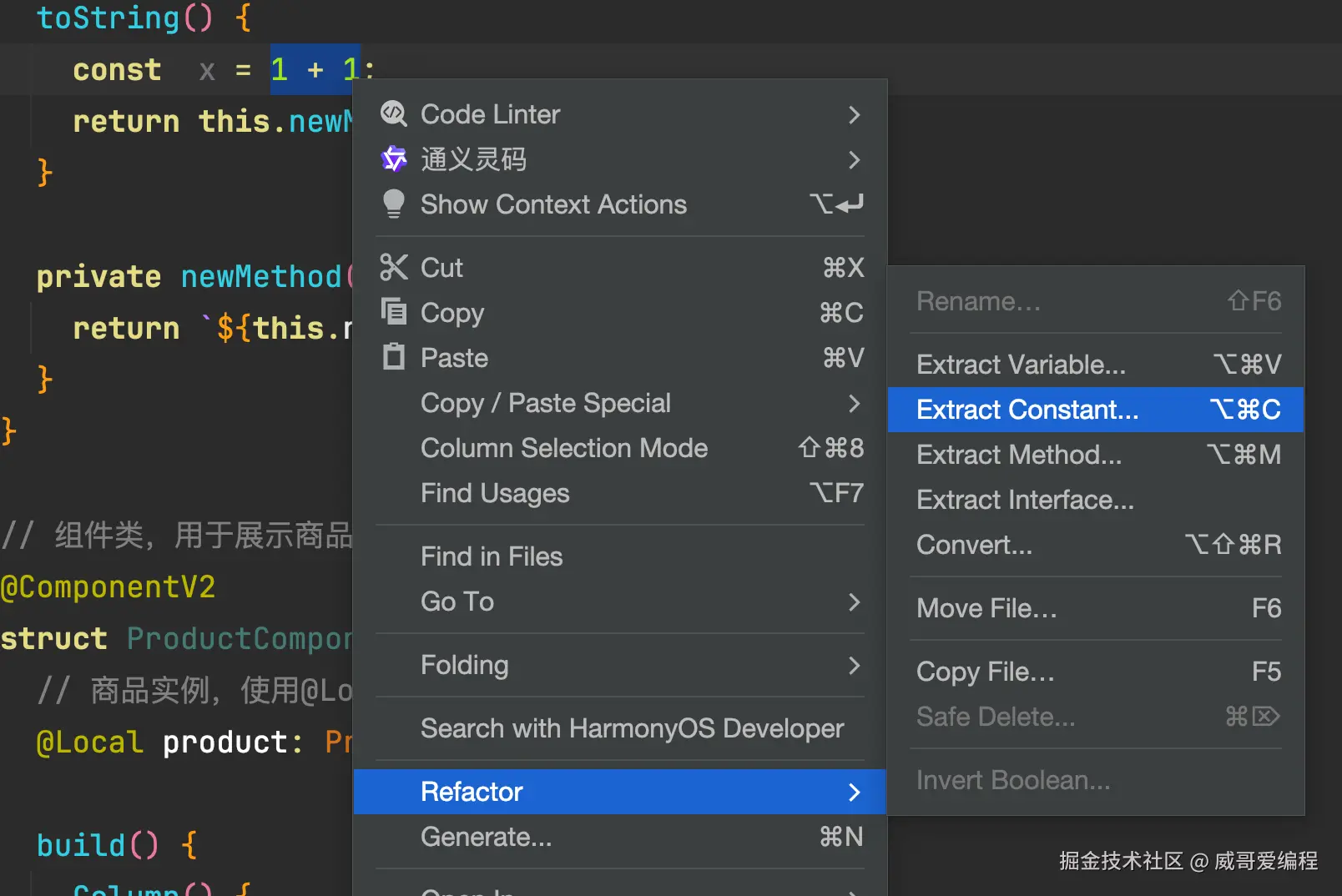 代码重构功能,在日常编码使用过程中会经常使用到,熟练使用这项功能,将大大提升我们的开发效率,用起来吧老铁们,让我们的代码飞起来,关注威哥爱编程,一起学鸿蒙开发。
