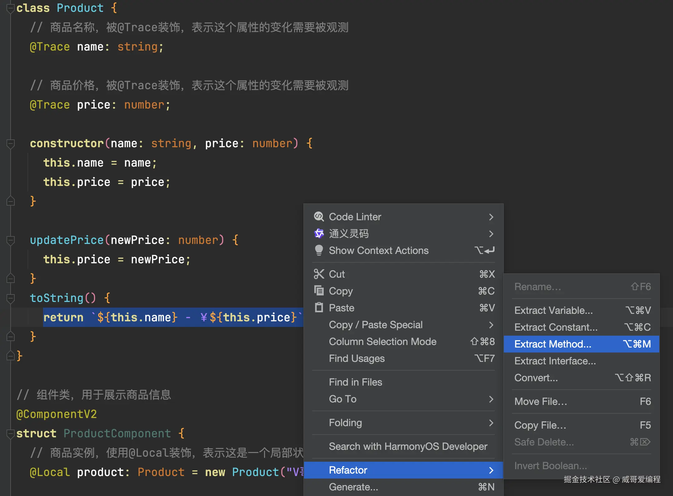 这不 DevEco Studio又升级了,发布了最新的5.0.1 Release版,在 DevEco 中代码重构功能用得好,可以提高我们的编码能力,下面 V 哥整理了使用代码重构功能,分享给大家。