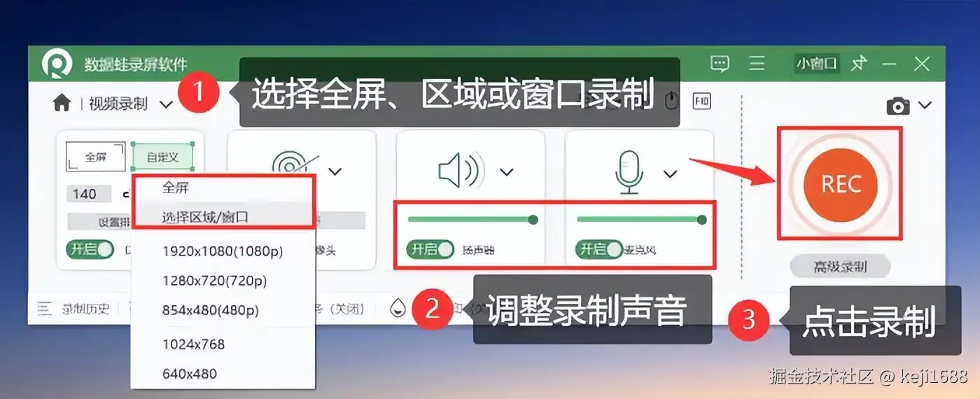 步骤2:在录制开始之前,选择需要录制的屏幕范围 (全屏录制、区域录制、窗口录制等) 然后对声音来源进行调整。设置完成点击 【REC】 按钮进行录屏。