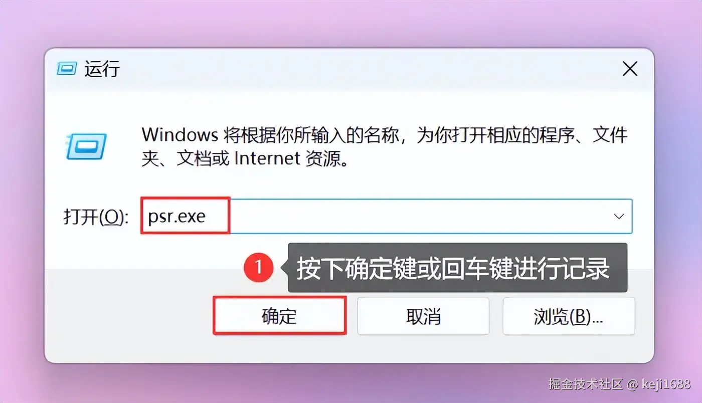 步骤1:按 【Win+R】 组合键打开运行窗口,输入 【psr.exe】 命令,然后按 【确定】 键打开步骤记录器。