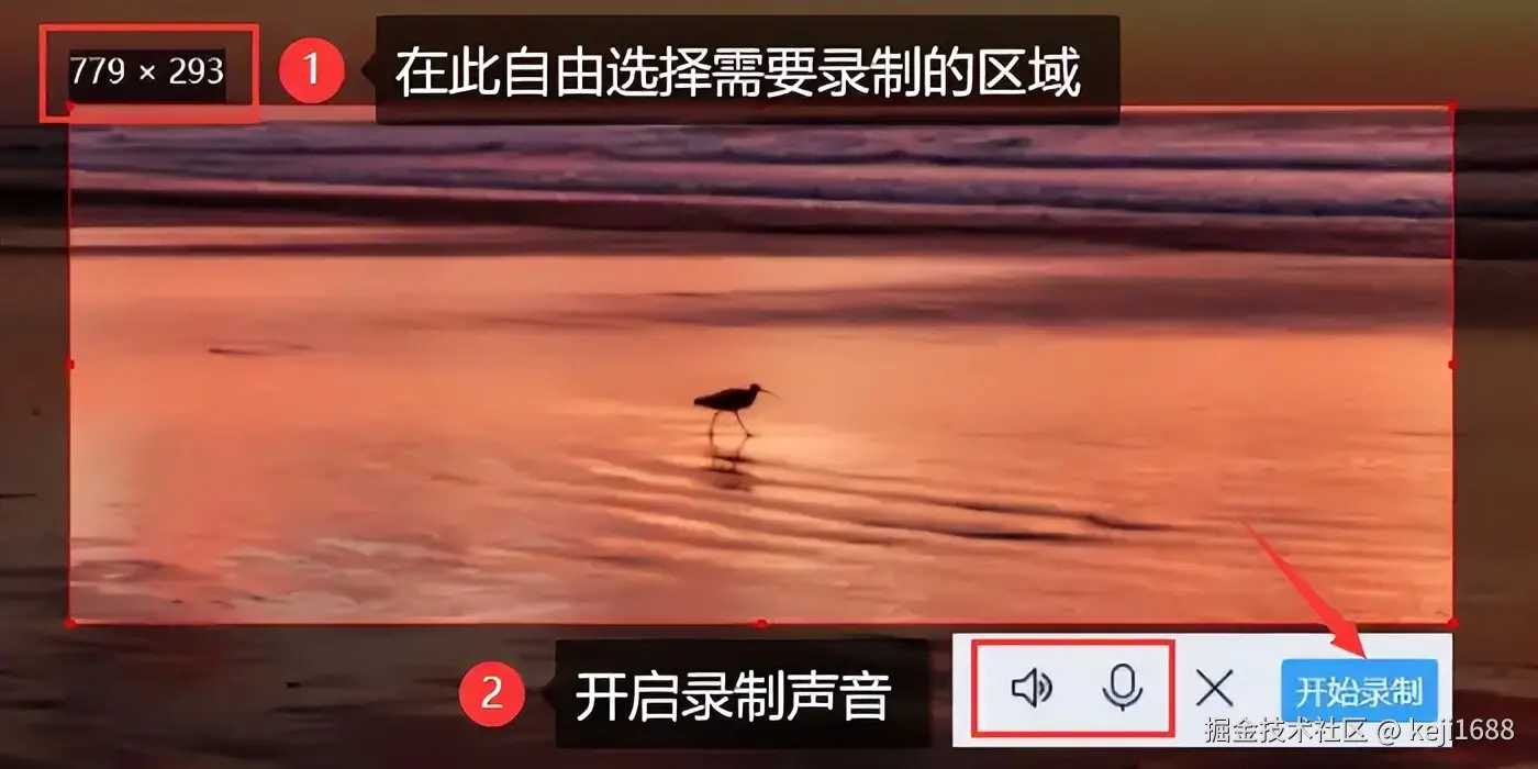 步骤2:选择录制的范围和开启录制声音,点击右下角的 【开始录制】 按钮录制。