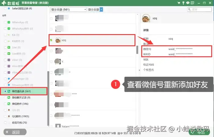 步骤2:根据软件的提示完成操作过程,扫描完成后点击 【微信通讯录】 并筛选你需要恢复的好友,查看好友的微信号,复制下来后回到微信进行重新添加即可。