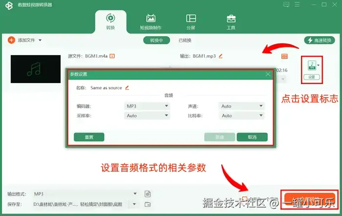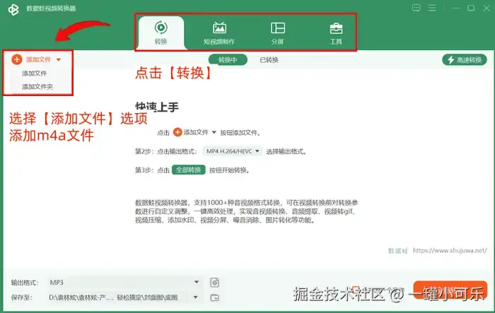 使用数据 蛙视频转换器将m4a转换成mp3的过程非常简单,用户只需将文件拖入软件界面,选择输出格式,然后点击转换按钮即可。这种方法的优点在于它的高效率和易用性,即使是对技术不太熟悉的用户也能快速上手。 下面介绍具体的将m4a转换成mp3格式的步骤。