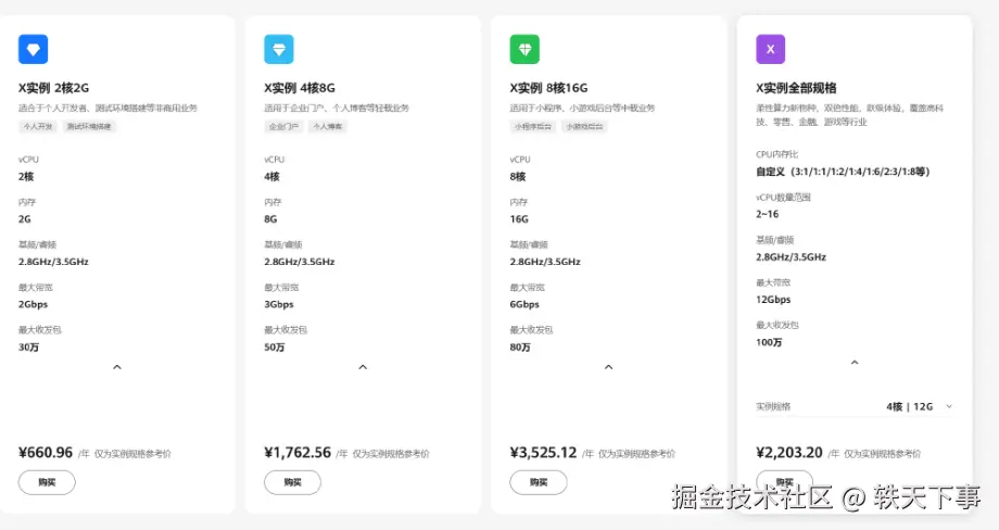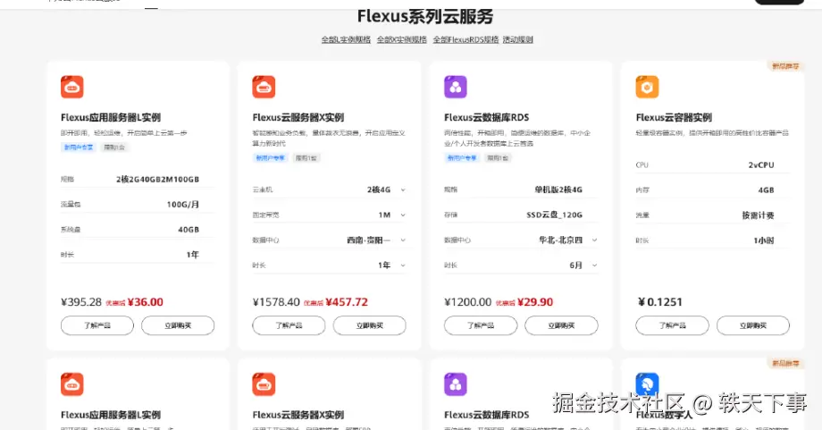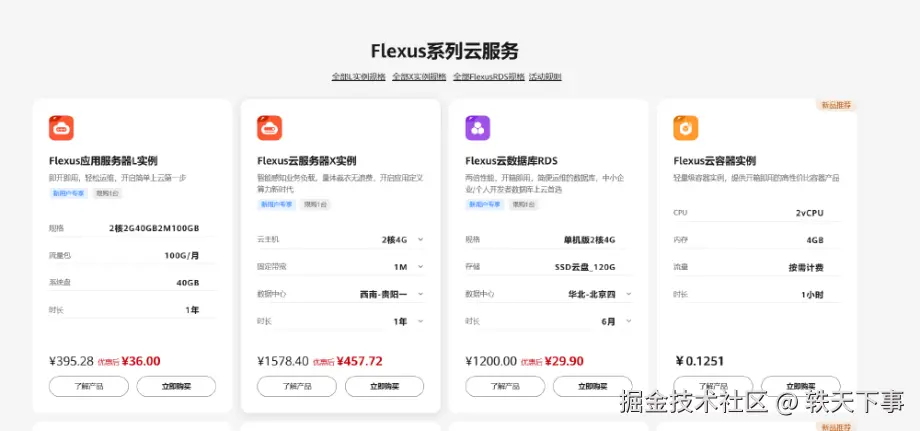 进入华为云官网后,点击云服务器,我们可以看到列出来了好多服务器,其中第二款就是我们今天的主角:Flexus 云服务器 X 实例,配置 2-4-1 的西南地区,一年售价大概是 457.72 元,说实话,在如今云服务器内卷的时代,这个价格并没有特别特别低,但是,这并不代表这款服务器的性能就不好,毕竟,一分价钱一分货!