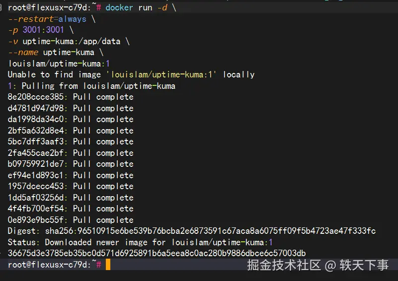 root@flexusx-c79d:# docker run -d --restart=always -p 3001:3001 -v uptime-kuma:/app/data --name uptime-kuma \louislam/uptime-kuma:1Unable to find image 'louislam/uptime-kuma:1' locally1: Pulling from louislam/uptime-kuma8e208ccce385: Pull complete d4781d947d98: Pull complete da1998da34c0: Pull complete 2bf5a632d8e4: Pull complete 5bc7dff3aaf3: Pull complete 2fa455cae2bf: Pull complete b09759921de7: Pull complete ef94e1d893c1: Pull complete 1957dcecc453: Pull complete 1dd5af03256d: Pull complete 4f4fb700ef54: Pull complete 0e893e9bc55f: Pull complete Digest: sha256:96510915e6be539b76bcba2e6873591c67aca8a6075ff09f5b4723ae47f333fcStatus: Downloaded newer image for louislam/uptime-kuma:136675d3e3785eb35bc0d571d6925891b6a5eea8c0ac280b9886dbce6c57003dbroot@flexusx-c79d:#
