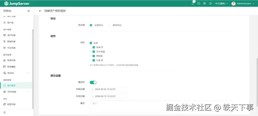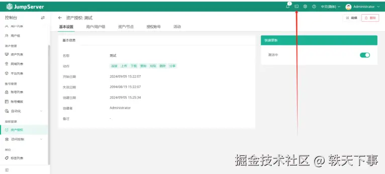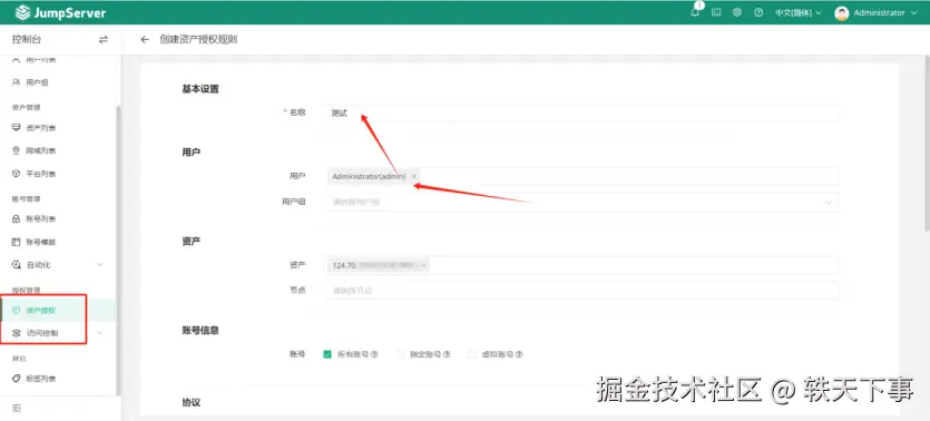 依次点击授权管理-资产授权-输出名称,选择用户组以及想要赋权的资产