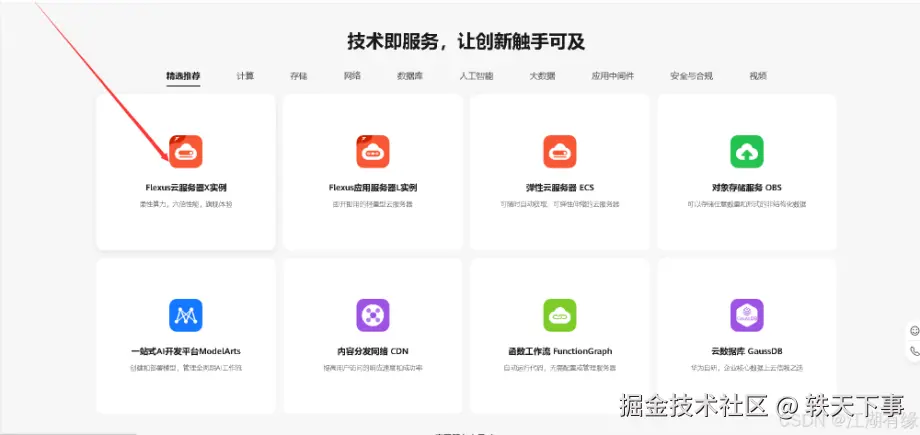 我们在华为云官网首页,精选推荐模块中,可以看到 Flexus 云服务器 X 实例,点击进入 Flexus 云服务器 X 实例主页。
