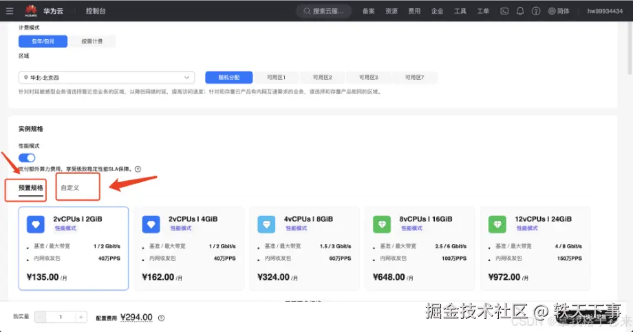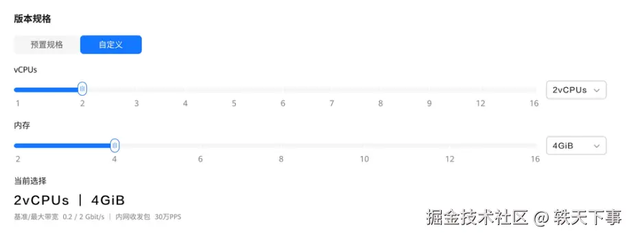 在购买页面,你可以选择预置规格 或自定义规格。Flexus X 实例的一大优势就是自定义配置功能,你可以根据业务需求,自由选择 CPU、内存、存储等资源,确保性能与成本的最佳平衡。