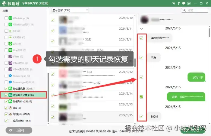 步骤2:扫描完成后,选择【微信聊天记录】 并勾选需要的聊天记录进行恢复。