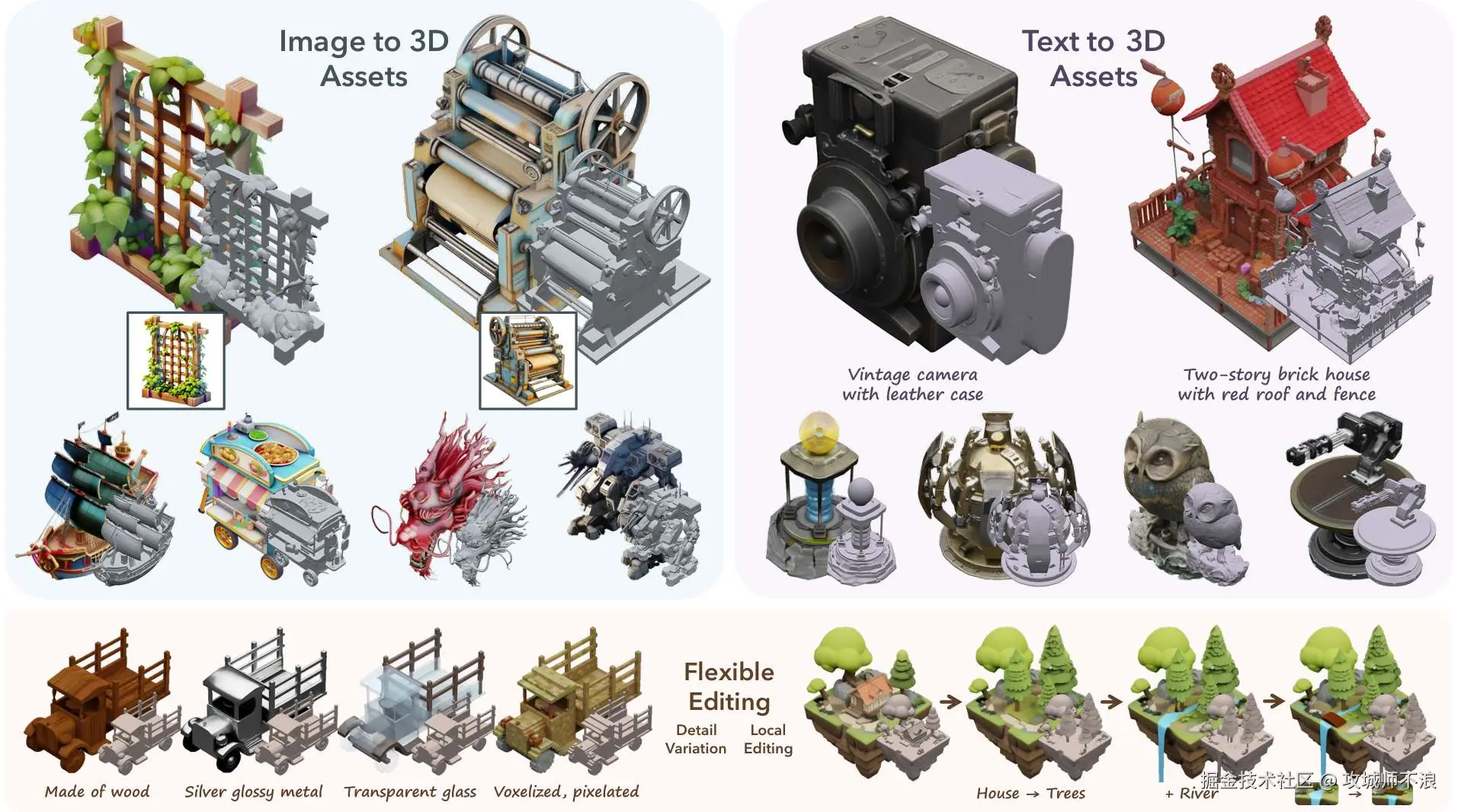 高质量生成:TRELLIS 能生成具有复杂几何结构和细致纹理的 3D 资产,效果远超现有技术。