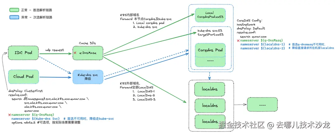 pod解析K8S内部域名, IDC Pod → q-dnsmasq(cache) → Coredns:xx53 & kube-dns:53