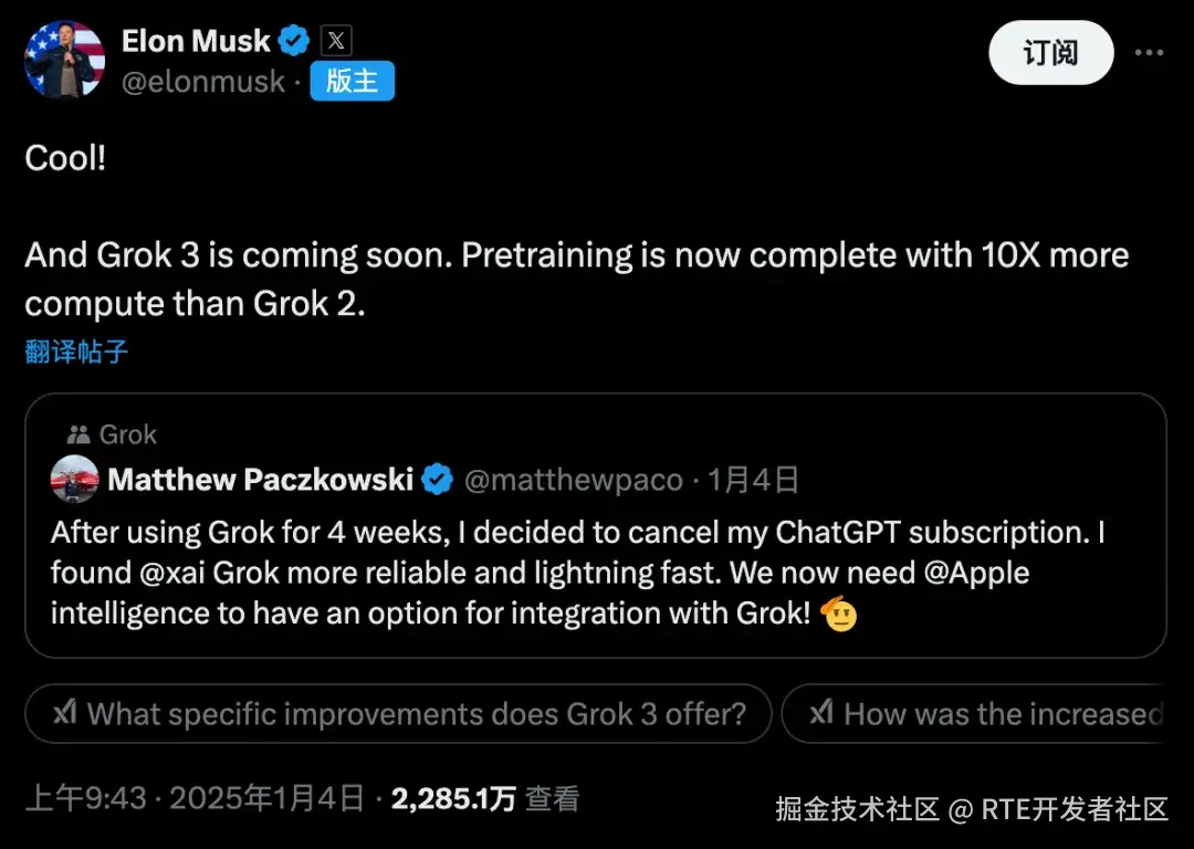 3、马斯克宣布 Grok 3 预训练已完成