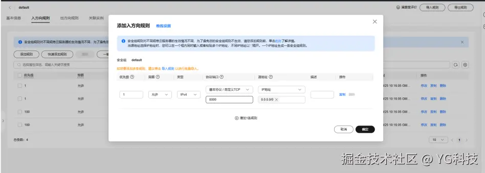 在控制台选择安全组,点击编辑规则,添加入站规则,选择优先级 1,TCP 8000 端口如下图: