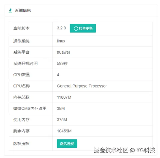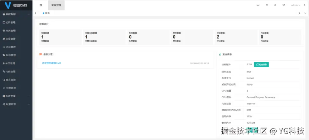 在系统后台的首页可以看到微微 CMS 的看板数据,在系统信息侧面可以看到对应的硬件信息和资源占用信息