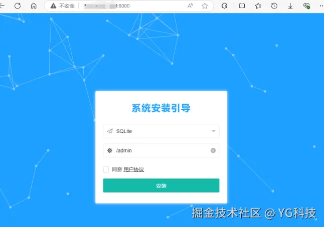 通过外网 IP+8000 端口进行浏览器访问,此时会跳转到微微 CMS 安装引导页面,这里我们选择 SQLite 的数据库进行安装。