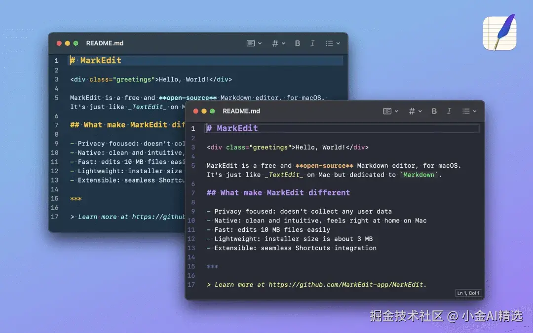 MarkEdit 是一款轻量级且高效的 Markdown 编辑器,专为 macOS 用户设计,安装包大小不到 3 MB。它以简洁的设计和流畅的性能,成为技术写作、笔记记录、博客创作以及项目文档编辑的理想工具。无论是编写技术文档、撰写博客文章,还是编辑 README 文件,MarkEdit 都能以快速响应和便捷操作帮助用户专注于内容创作。