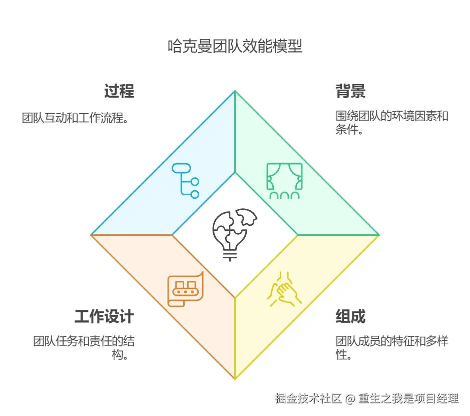 模型内容: 哈克曼模型通过四个维度分析团队效能:背景(Context)、组成(Composition)、工作设计(Work Design)和过程(Process)。模型强调要创建有利于团队协作的环境,通过合理的工作分配、角色清晰和高效的决策过程来提高团队效能。