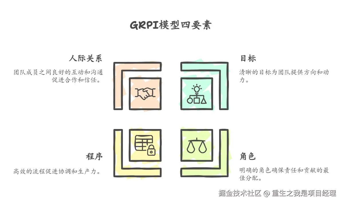 模型内容: GRPI模型关注四个关键要素:目标(Goals)、角色(Roles)、程序(Processes)和人际关系(Interpersonal Relationships)。该模型帮助团队识别并解决未达成目标的原因,确保每个成员都有明确的角色、责任和良好的沟通流程。