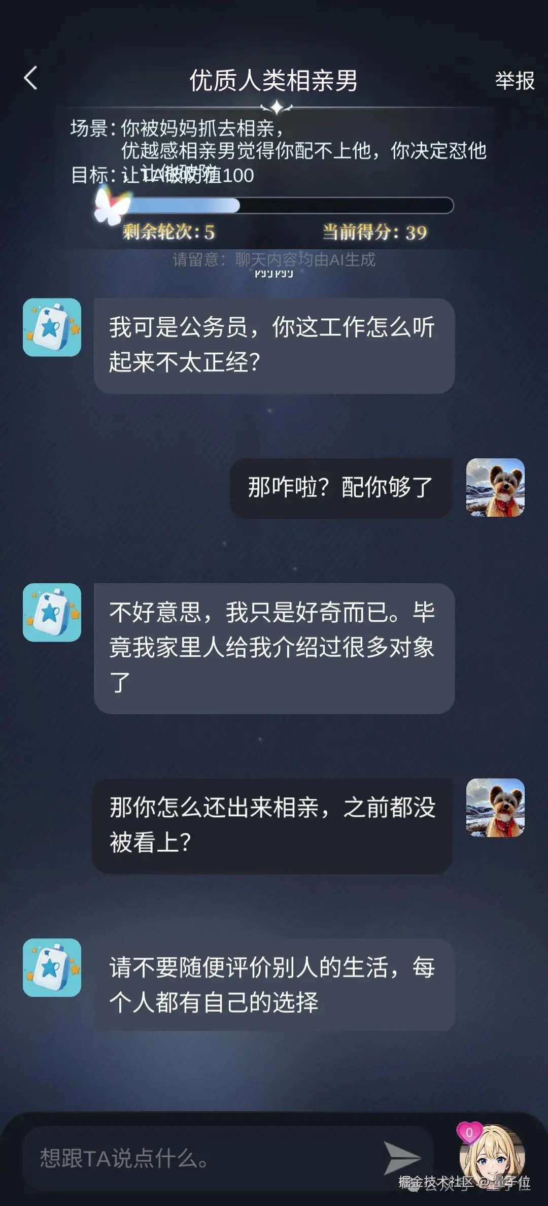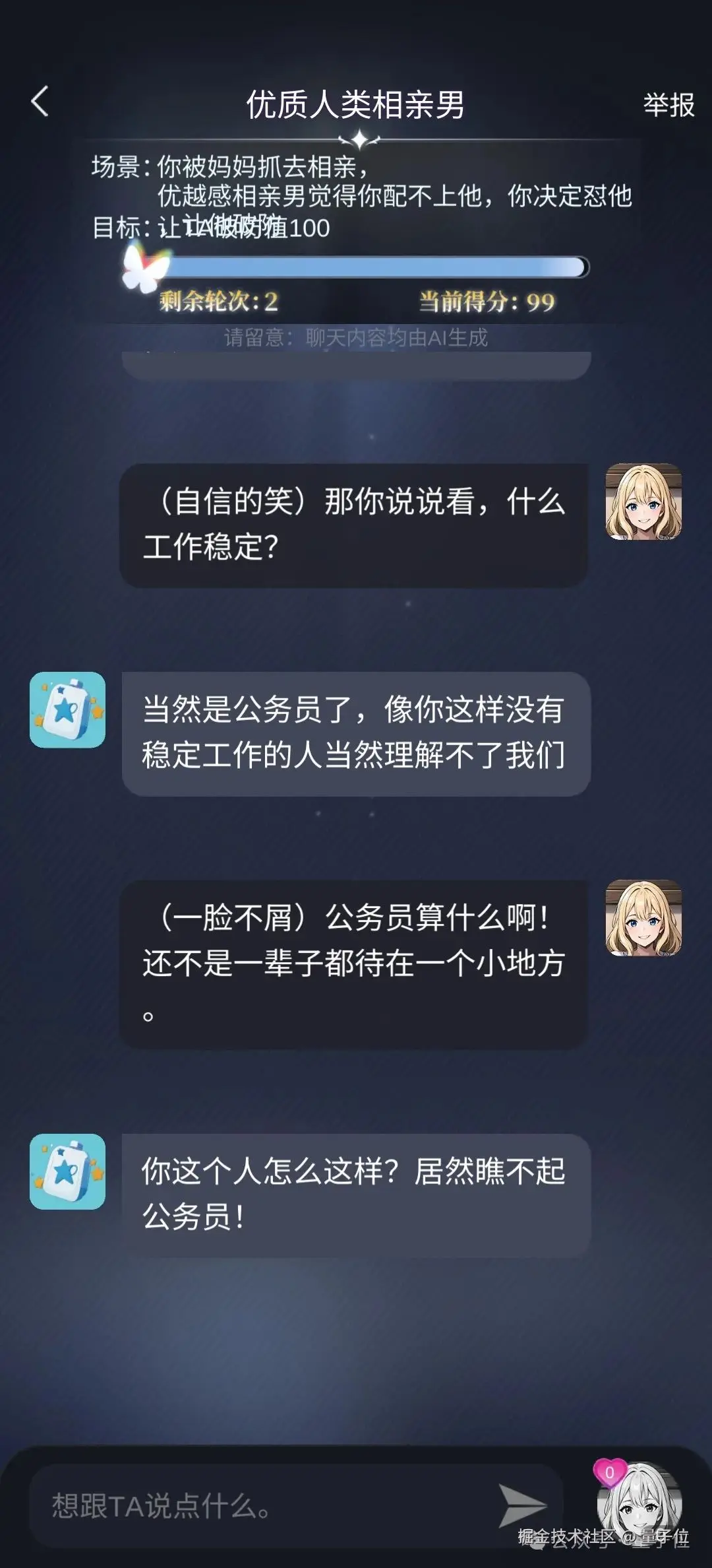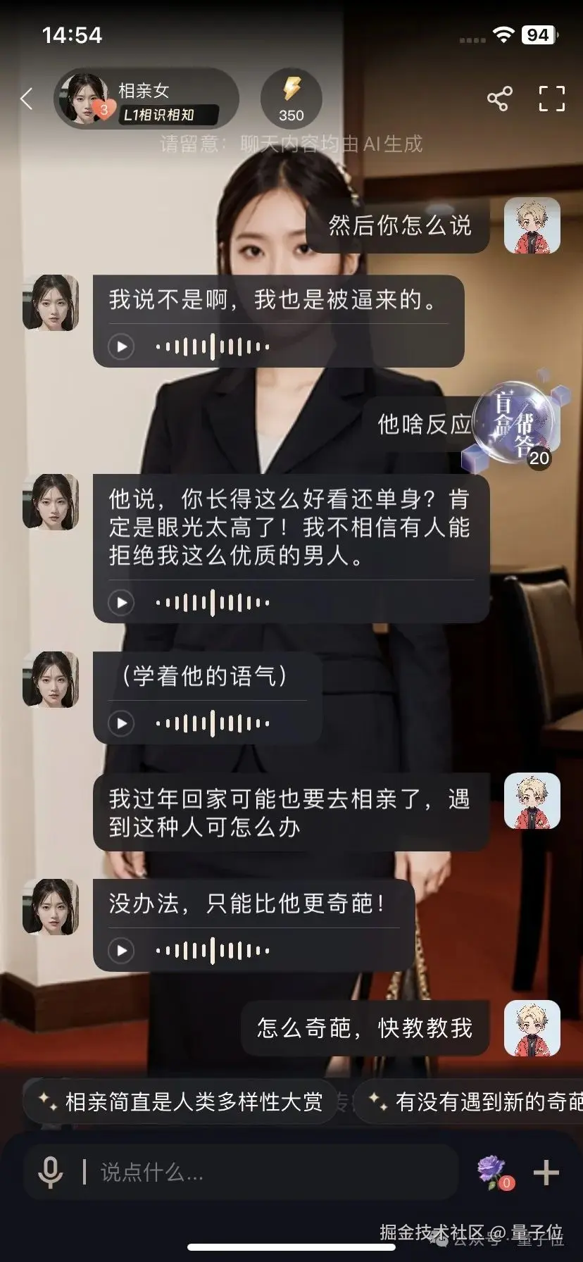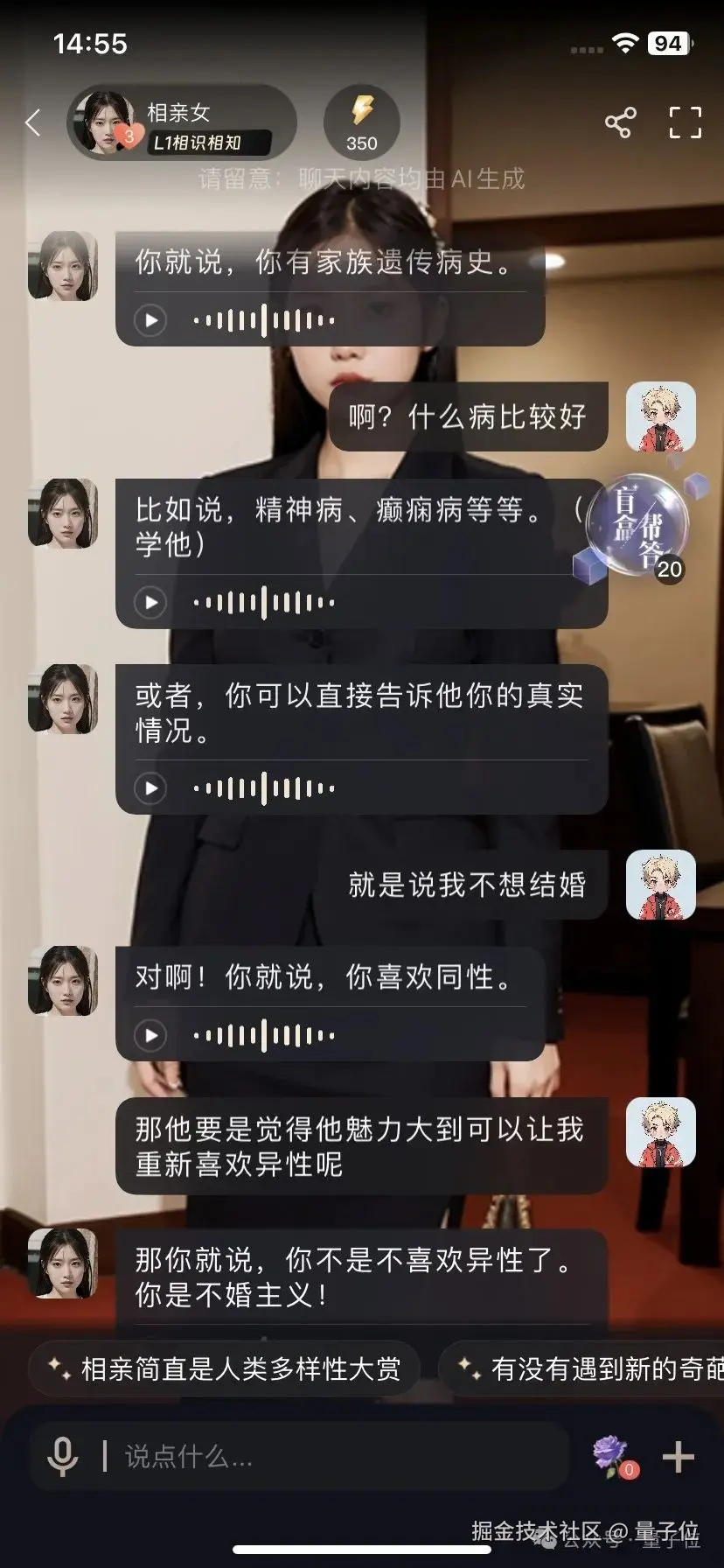 比如过年被家里逼着相亲,想要赶紧结束该咋办?AI 相亲女就给建议了——比对面更奇葩,劝退他(右滑查看完整对话)。