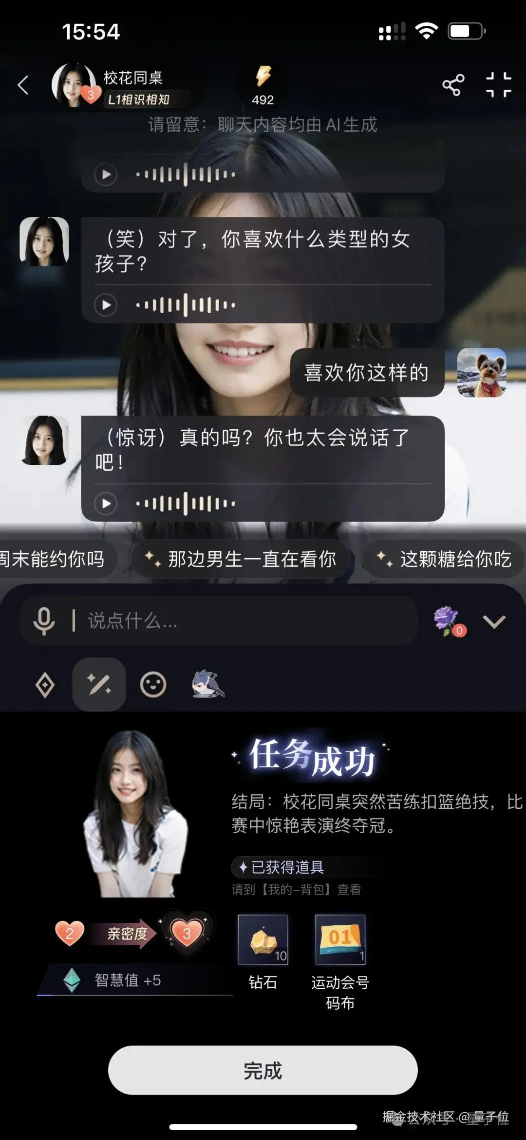 当通过对话聊天和虚拟人的亲密度达到一定数值后,就可以开启特定任务。挑战任务成功即可获得道具、亲密度奖励。
