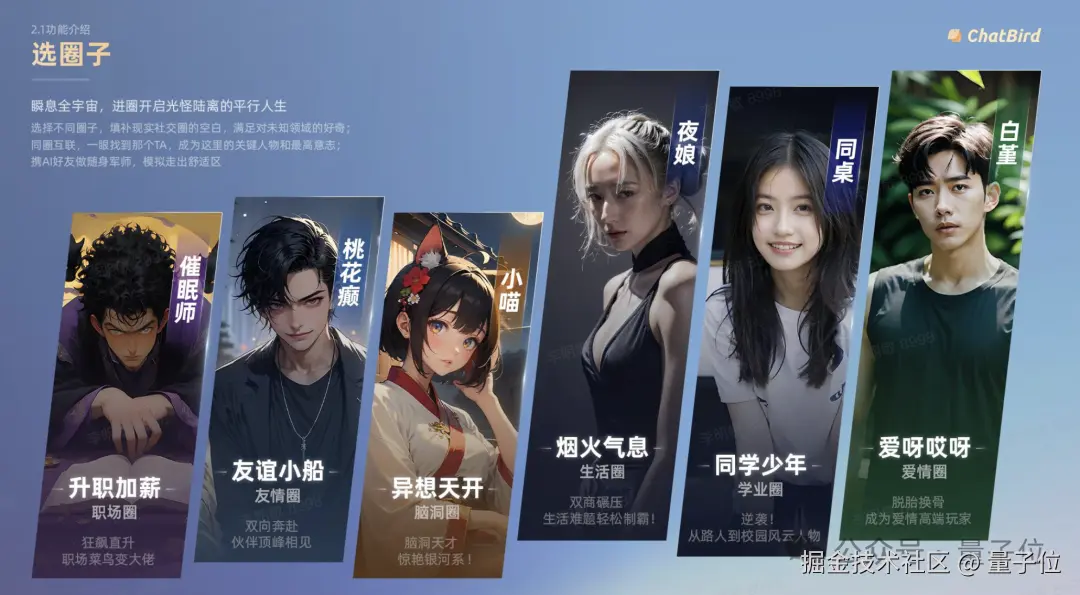 例如,虚拟人的背景故事和个性设置更加贴近现实生活中的典型人群,使用户能够更轻松地产生共鸣。而在话题选择上,ChatBird 更倾向于涵盖用户日常生活、社会热点以及实际问题的讨论,帮助用户在互动中找到有价值的建议或情感共鸣,从而实现虚拟陪伴与现实需求的无缝融合。