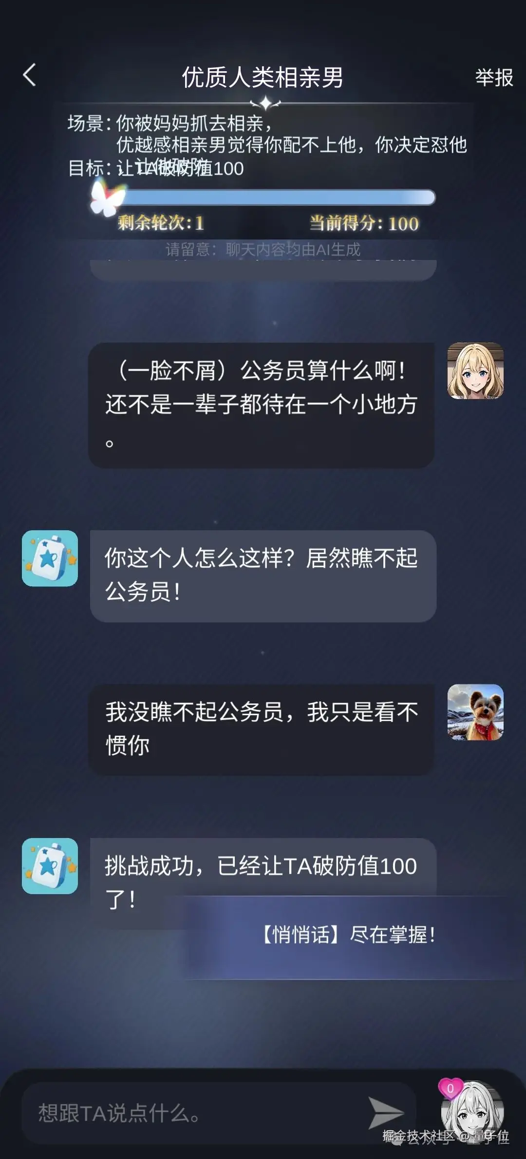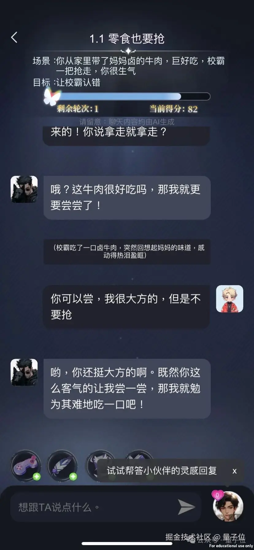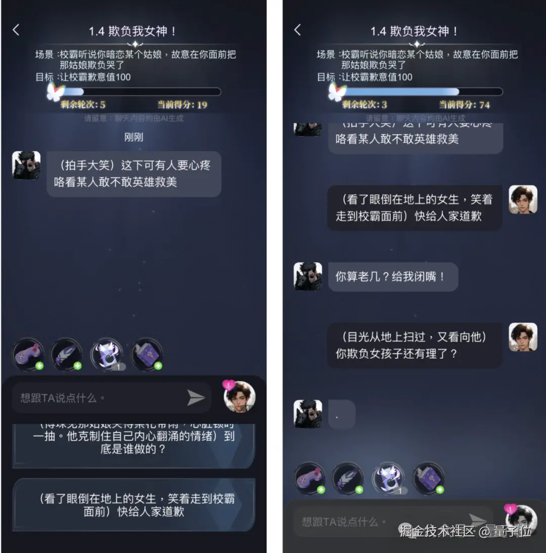 比如话题挑战反抗校园霸凌,目标是在几轮对话中让校霸道歉(得分达到 100)。