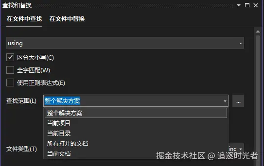 Ctrl + F:支持查找范围,和文件类型查找,并且支持区分大小写、全字匹配和使用正则表达式查找。