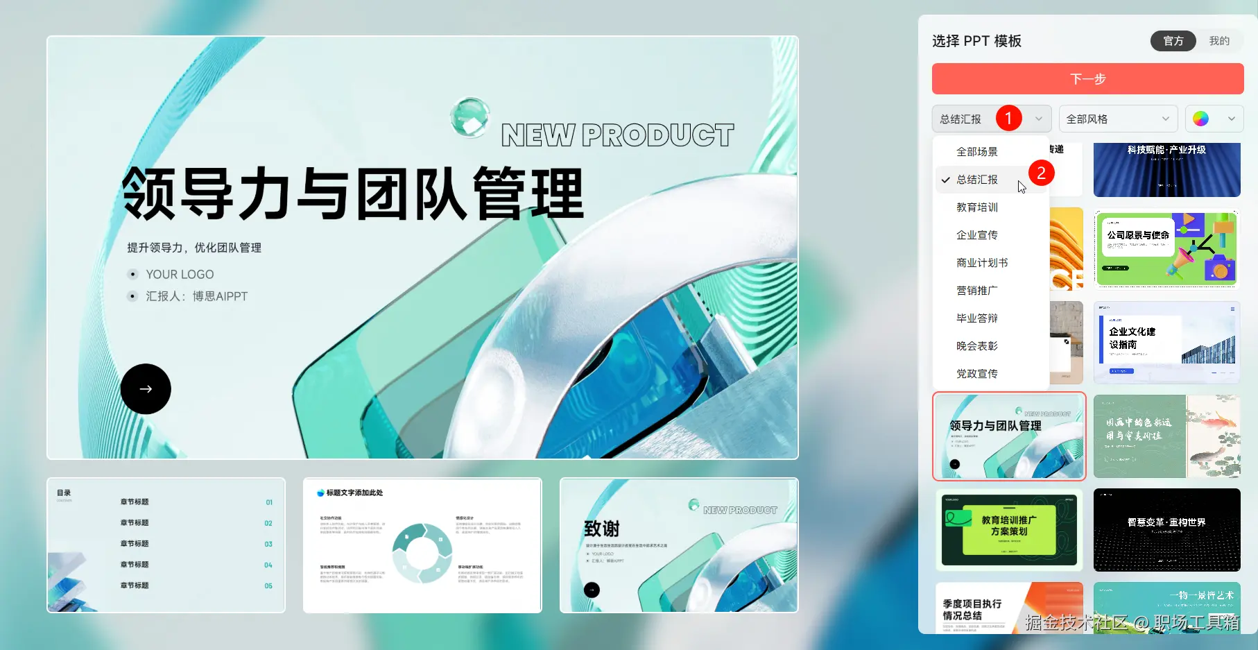 - 挑选模板:先选择PPT模板,再基于前面3种方式生成PPT