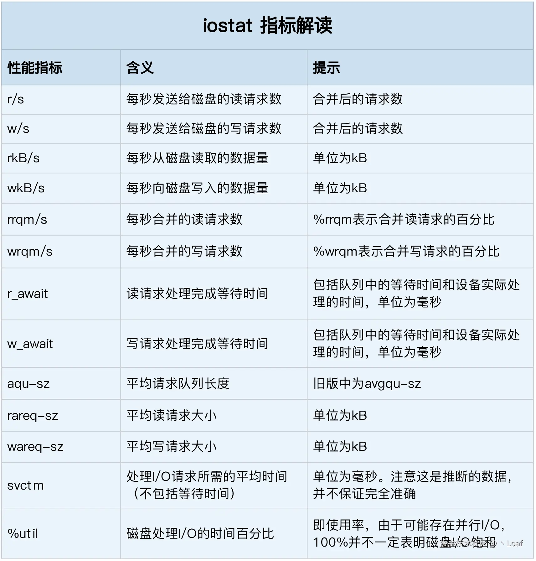 熟悉了指标之后,就需要进行观测。首先我们对磁盘I/O进行观测,一般我们熟悉的观测工具就是iostat,它提供了每个磁盘的使用率、IOPS、吞吐量等各种常见的性能指标,当然,这些指标实际上来自 /proc/diskstats。
