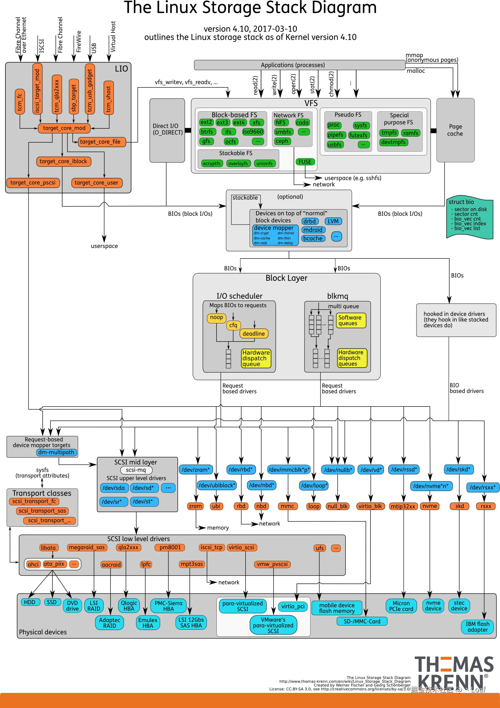 - I/O 请求被转发到合适的 协议子系统,如 SCSI 中层,并进一步解析 BIO 请求为设备命令(如读写块命令)。