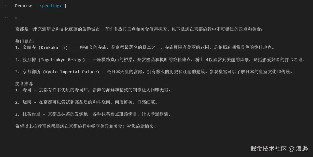 在确定了具体的旅游城市后,接下来自然是要了解这个城市有哪些值得去的地方,也就是查找该城市的热门景点。所以第二个阶段的任务就是让语言模型依据上一阶段得到的城市名称,列举出这个城市的三个热门景点。此时就像我们已经到了目的地,开始规划具体要去游玩的景点了。