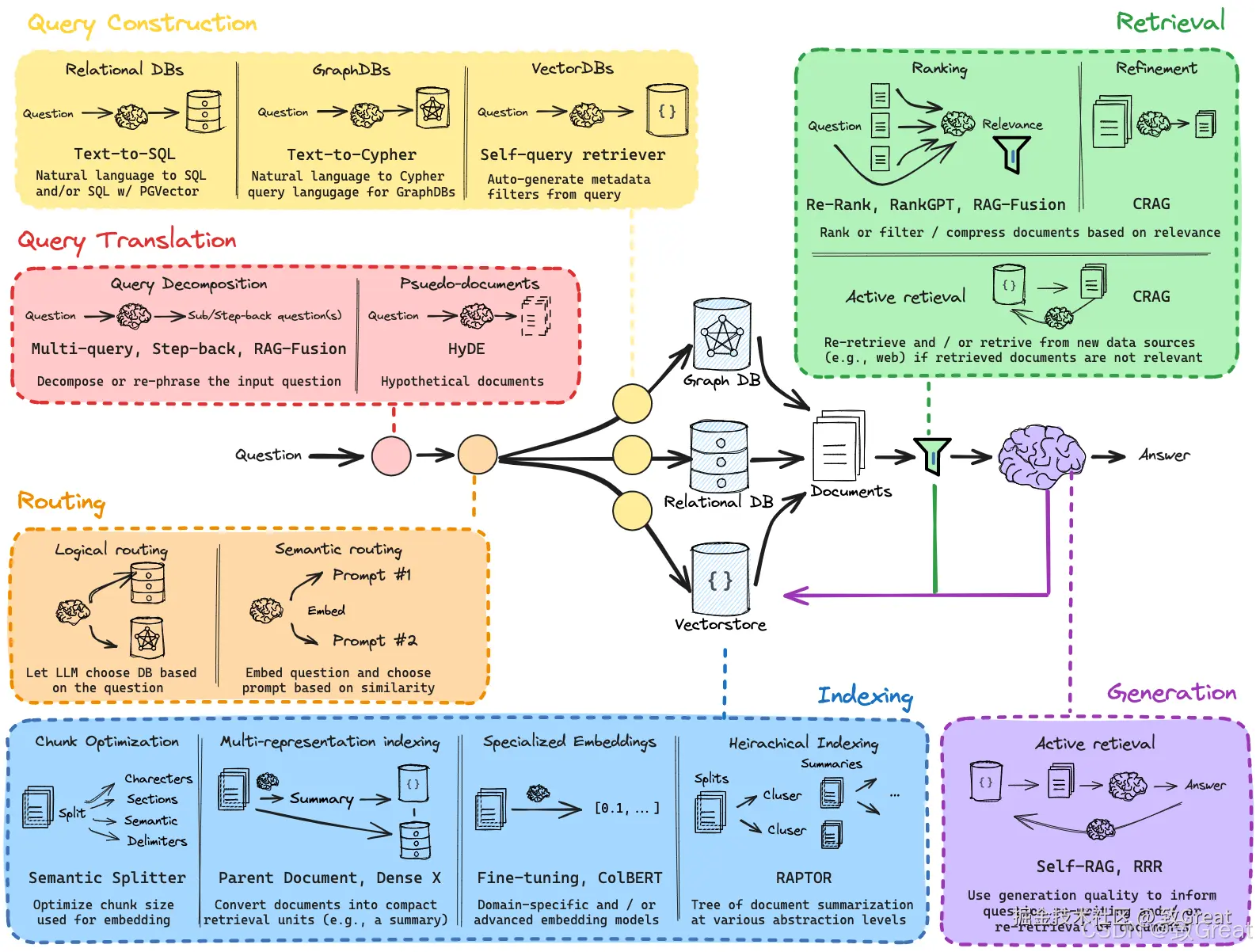 - 多表示索引:设置多向量索引结构以处理具有不同嵌入和表示的文档。