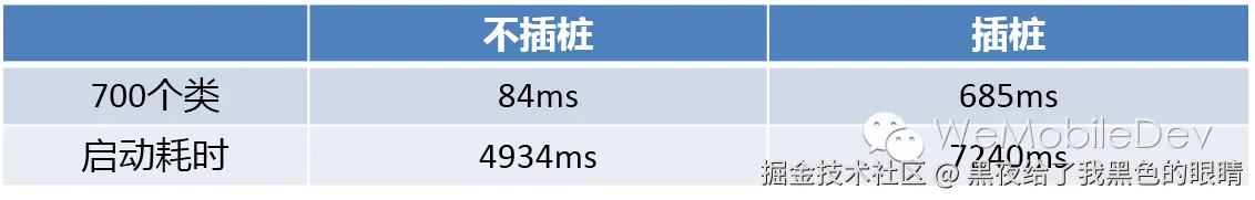 若采用插桩导致所有类都非preverify,这导致verify与optimize操作会在加载类时触发。这会有一定的性能损耗,微信分别采用插桩与不插桩两种方式做过两种测试,一是连续加载700个50行左右的类,一是统计微信整个启动完成的耗时。