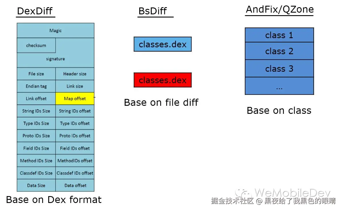 有没有那么一种方案,能做到开发透明,但是却没有Qzone方案的缺陷呢?Instant Run的冷插拔与buck的exopackage或许能给我们灵感,它们的思想都是全量替换新的Dex。即我们完全使用了新的Dex,那样既不出现Art地址错乱的问题,在Dalvik也无须插桩。当然考虑到补丁包的体积,我们不能直接将新的Dex放在里面。但我们可以将新旧两个Dex的差异放到补丁包中,最简单我们可以采用BsDiff算法。