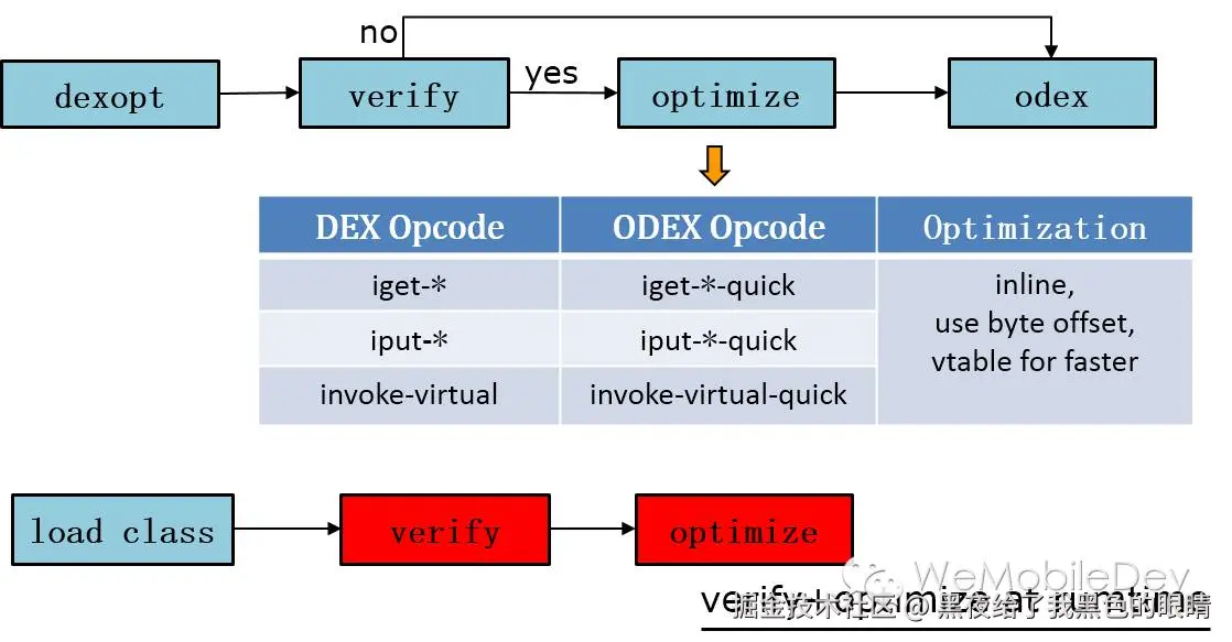 - Dalvik; 在dexopt过程,若class verify通过会写入pre-verify标志,在经过optimize之后再写入odex文件。这里的optimize主要包括inline以及quick指令优化等。