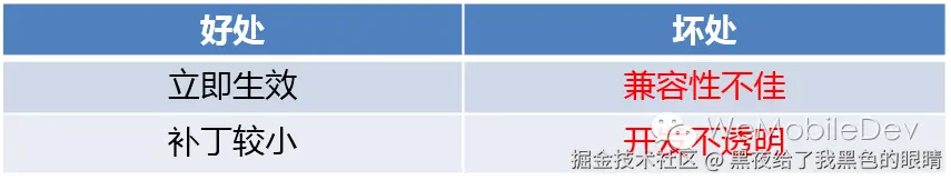 热补丁技术也可以理解为一个动态修改代码与资源的通道,它适合于修改量较少的情况。以微信的多次发布为例,补丁大小均在300K以内,它相对于传统的发布有着很大的优势。