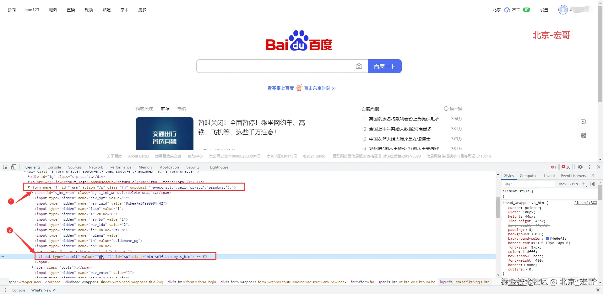 在被测试百度网页中,按照宏哥在上卷中5.2中的方法 (1)查找输入框并输入“北京宏哥”,如下图所示:(2)查找“百度一下”按钮,如下图所示:(3)点击“百度一下”按钮。