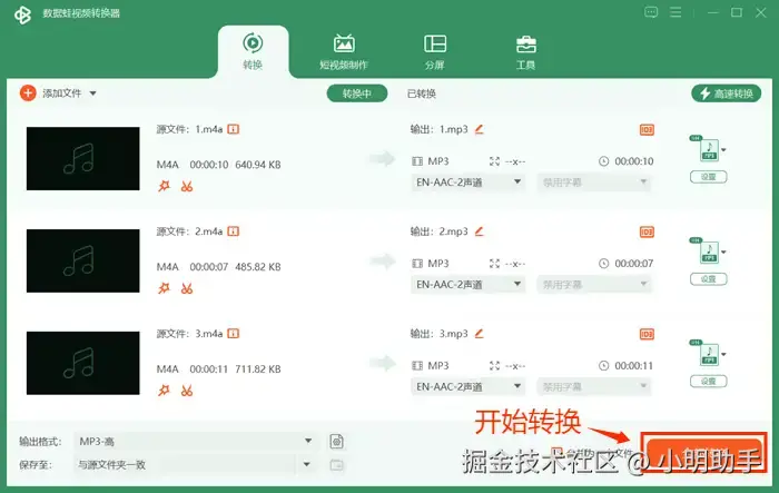 总的来说,m4a转换mp3在线完成的方法有很多,用户可以根据自己的需求和场景选择合适的方法。无论是临时转换还是批量处理,都能找到适合自己的解决方案。而使用数据 蛙视频转换器这一款高效、高质量的转换工具来进行转换,它强大的功能、快速的转换速度和简洁的操作界面,无疑能够使得m4a转mp3变得更加轻松和高效。
