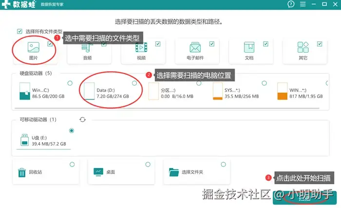 步骤1: 在电脑里打开数据 蛙恢复专家,然后选择自己需要恢复的文件类型和需要扫描的电脑位置,最后点击按钮开启扫描;