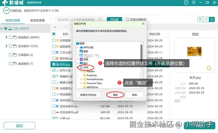 步骤3: 点击“导出”后,在弹窗中选择自己需要存放恢复文件的位置。