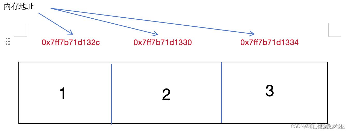 由于 int 类型一般情况下占用内存为 4 字节,在内存地址中它们的分配空间是相临的,所以上面的 3 个物理地址(16 进制)每个相差为 4。