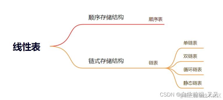 线性表的存储结构分为线性存储结构和链式存储结构,线性存储结构称为顺序表,链式存储结构称为链表。链表又分为单链表、双链表、循环链表、静态链表。