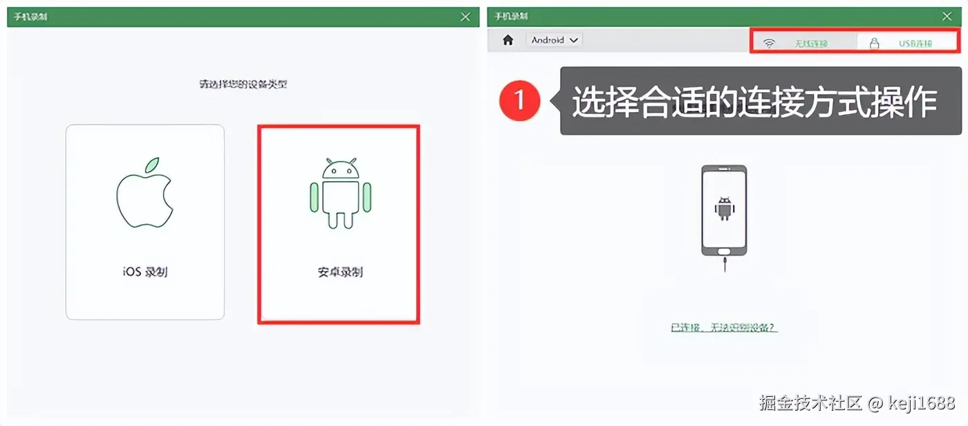 步骤1:在电脑上启动软件,并在众多的录制模式中选择 【手机录制】 模式,根据软件的提示选择合适的方式将手机和电脑连接在一起。