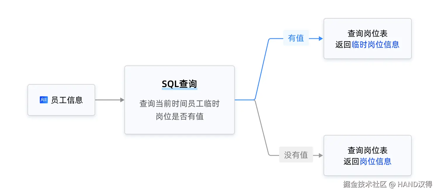 在人力资源管理业务中,员工可能会有正式岗位和临时岗位,需根据当前日期获取员工当前的岗位。