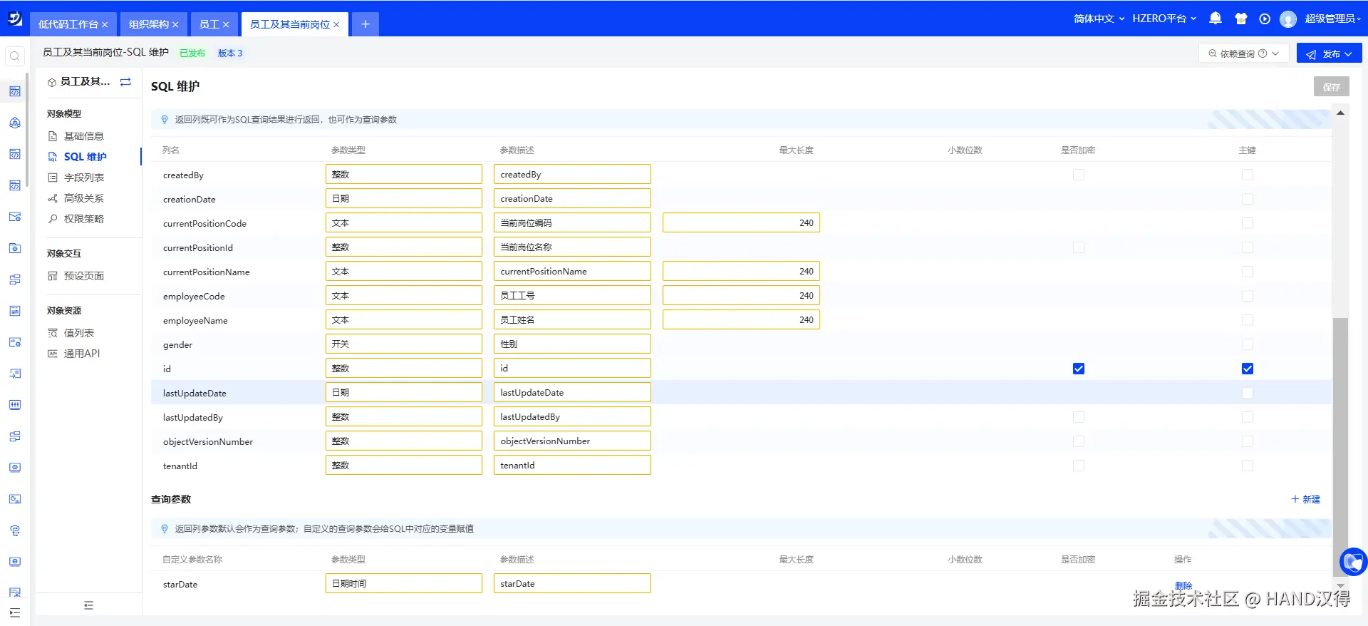 ⑤ 保存SQL维护,解析的参数将按照其参数类型等属性自动生成字段列表中对应属性的对象字段,在字段列表修改对的属性会同步至参数属性中。
