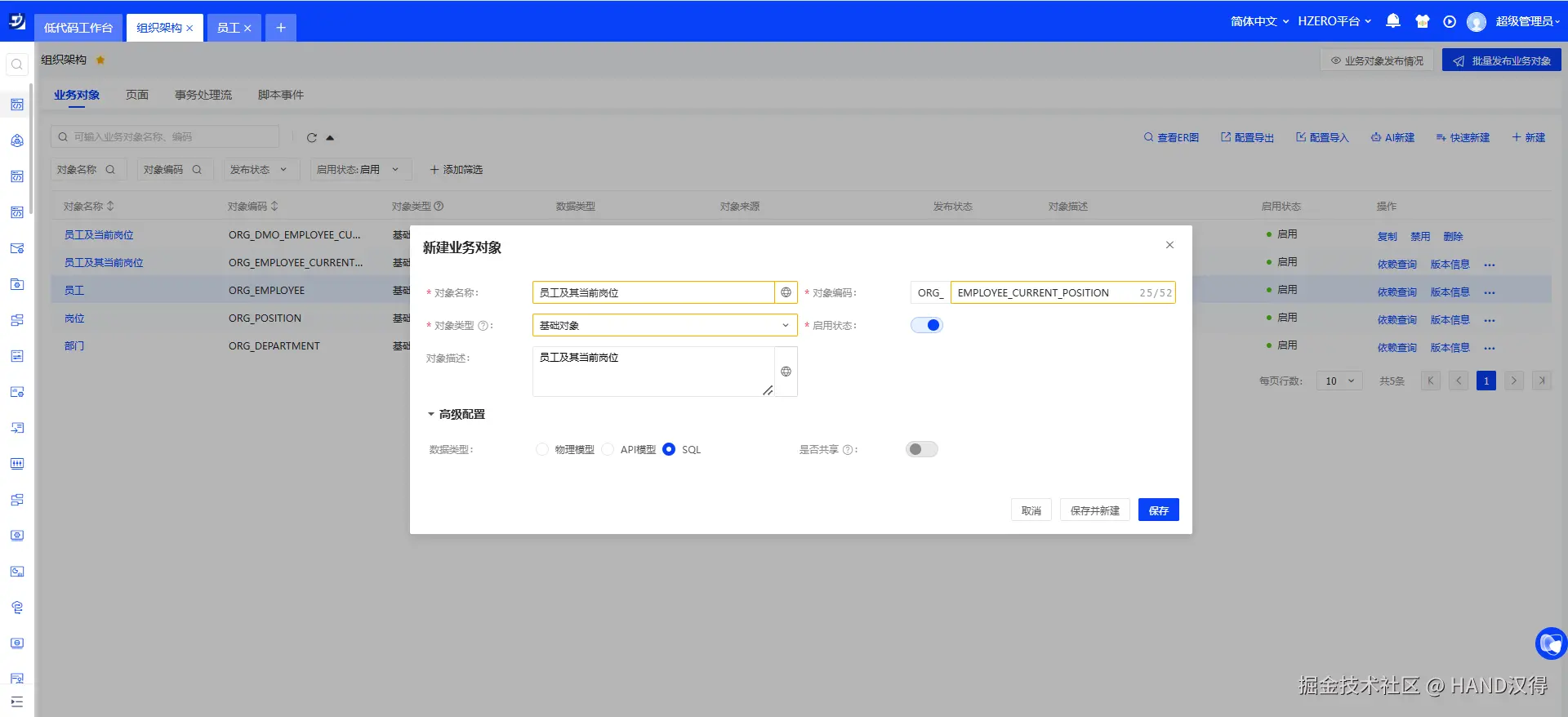 ① 新建业务对象,对象类型选择基础对象,高级配置数据类型选择SQL。