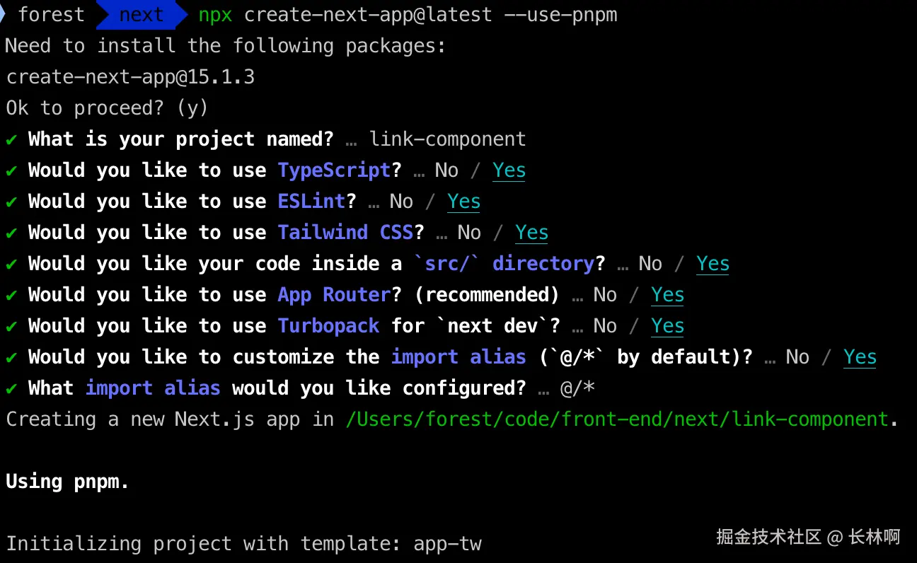 使用命令 npx create-next-app@latest --use-pnpm 创建一个新的项目;具体的项目配置选项如下: